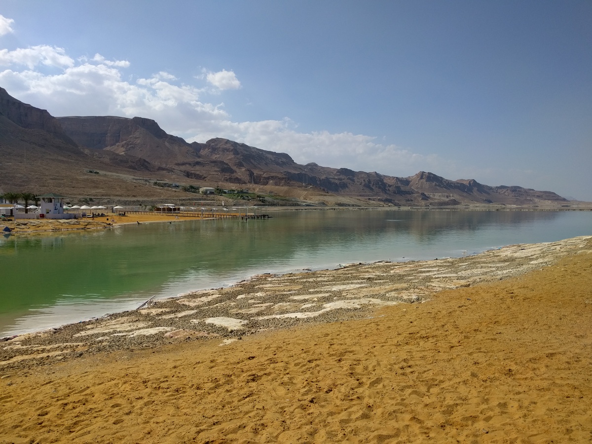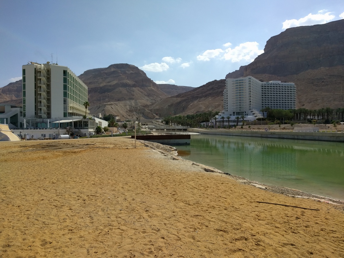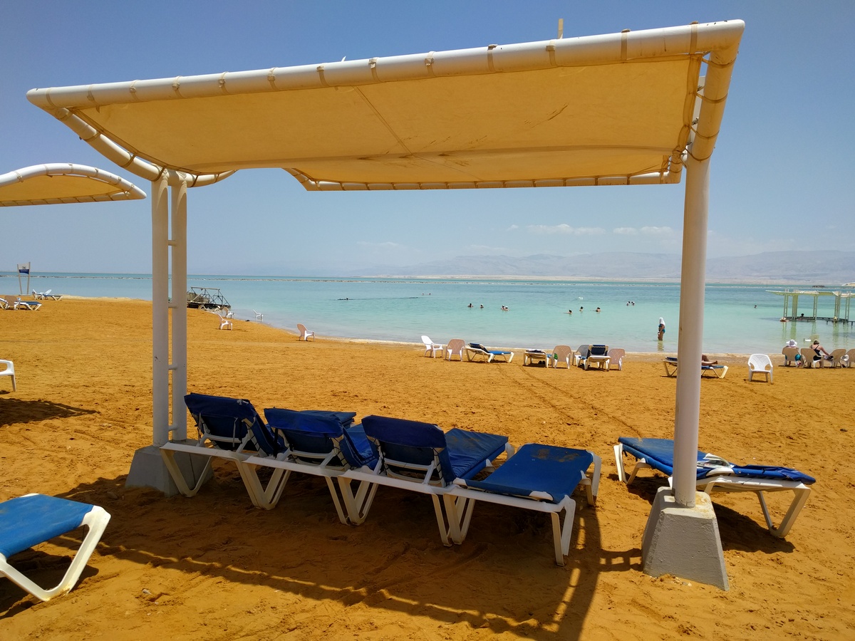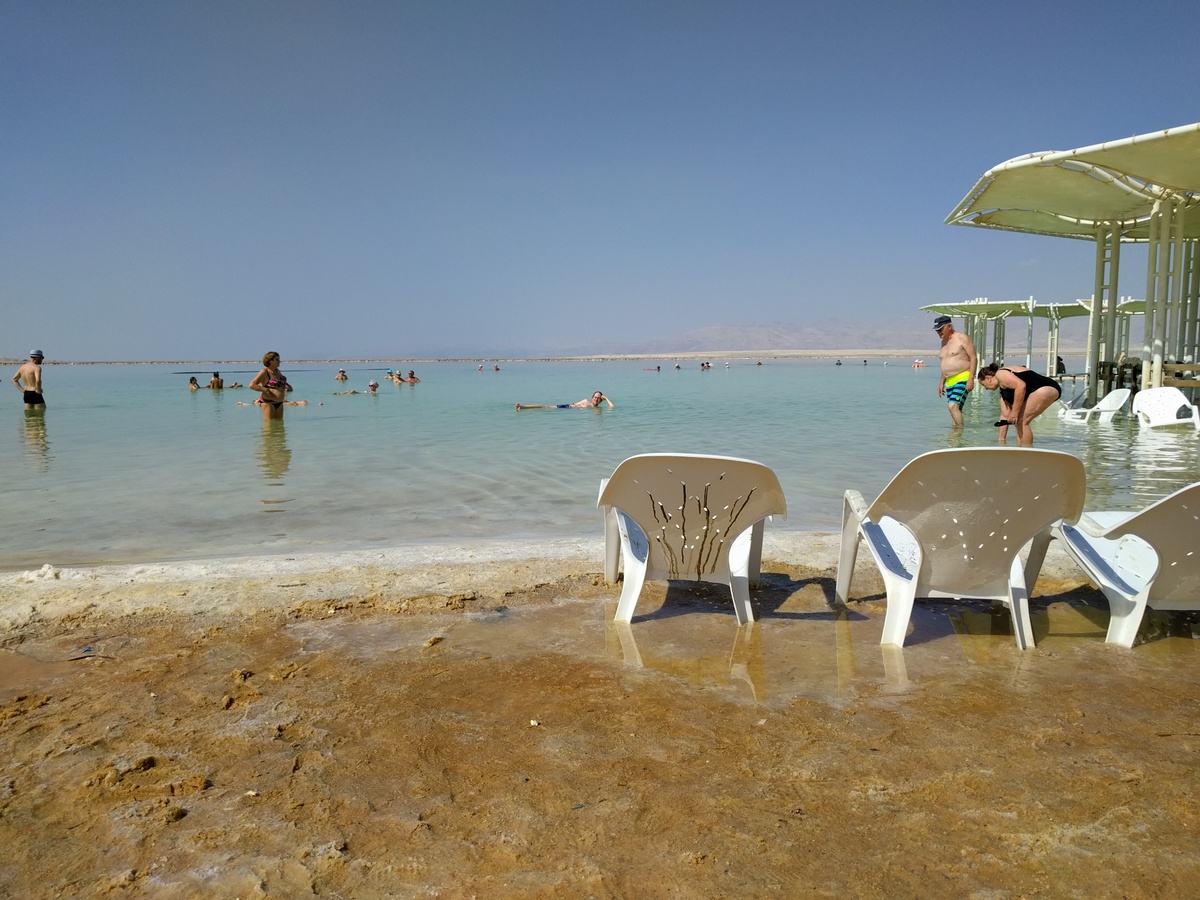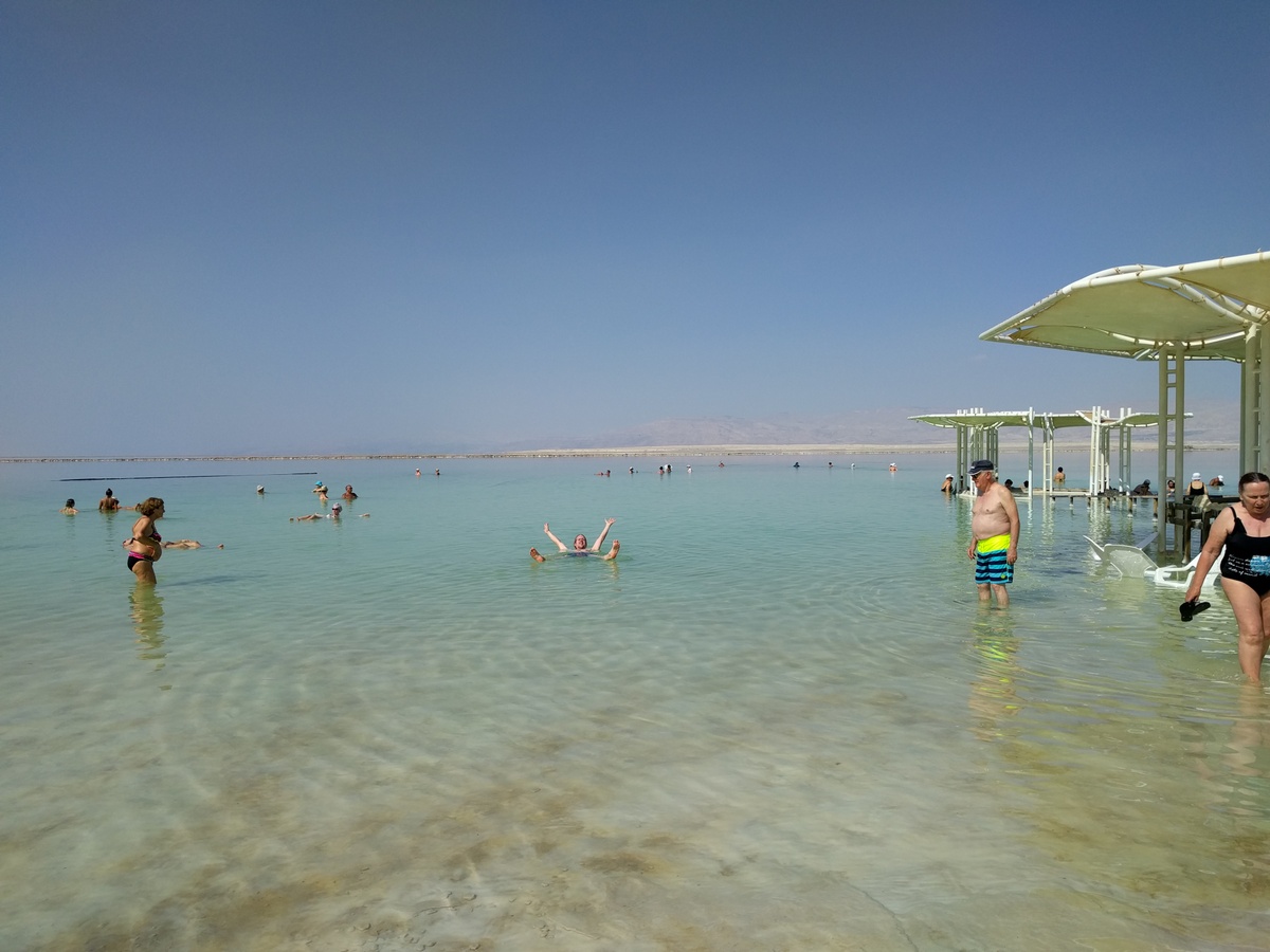 Einzigartig ist ein Ausflug zum Toten Meer, wie hier in En Bokek. Scheinbar gegen alle Gesetze der Physik treibt man am Schwarzen Meer an der Wasseroberfläche ohne dabei schwimmen zu müssen. Faktisch spielt natürlich Physik eine Rolle: Das verdrängte Wasser wiegt mehr als der Körper.