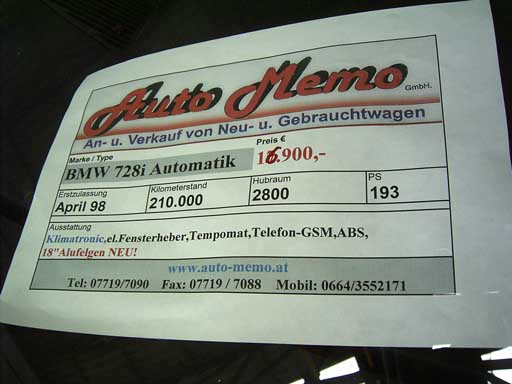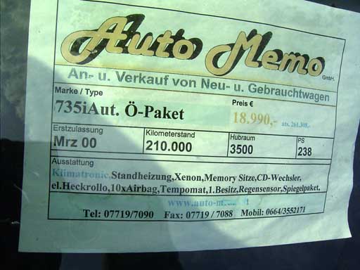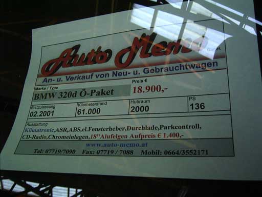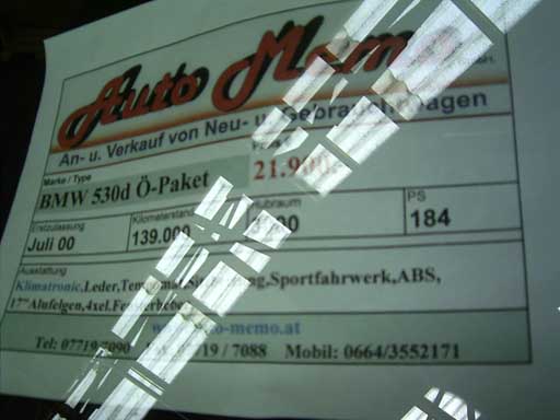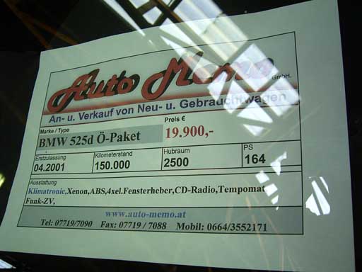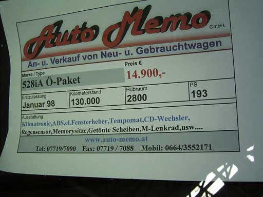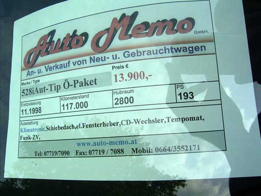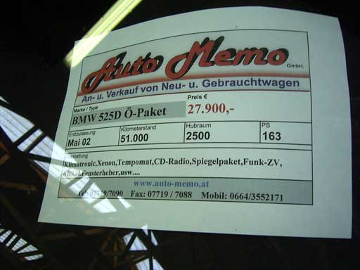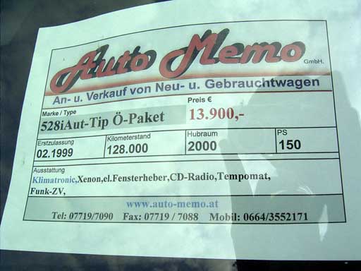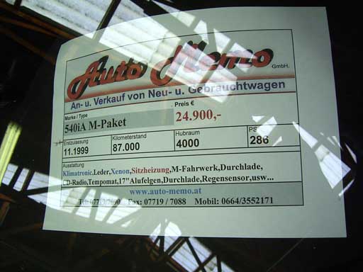 Unter Intention Bruxxxi's begab ich mich am 14. Mai 2004 auf eine fast schon abendteuerliche Reise an die Grenze Österreichs: Schärding (OÖ). Es galt einen schicken aber auch ökonomischen E39 zu finden. Um 13:00 gings zum Westbahnhof in den Zug nach Amstetten, hier fuhr aufgrund eines Unfalls auf der Westbahn nichts, also ab per Bus nach St.Pölten, wo niemand so recht wusste welcher Zug eigentlich nun nach Salzburg gehe, ich hatte aber Glück.