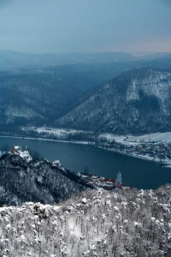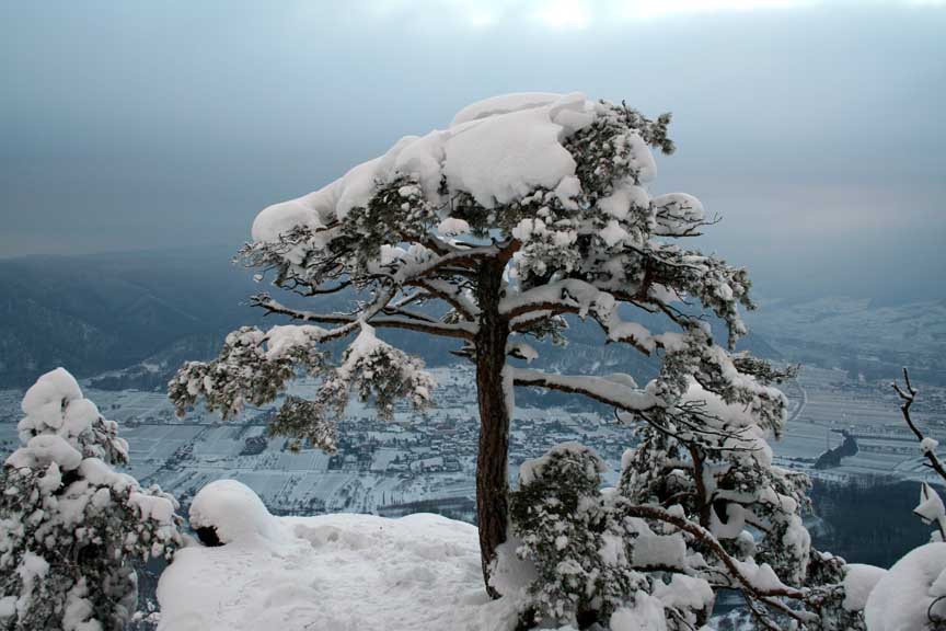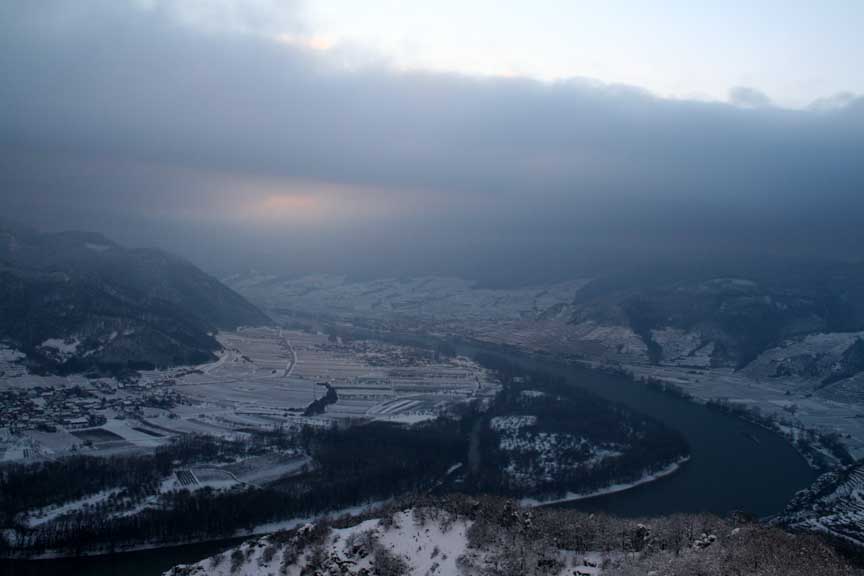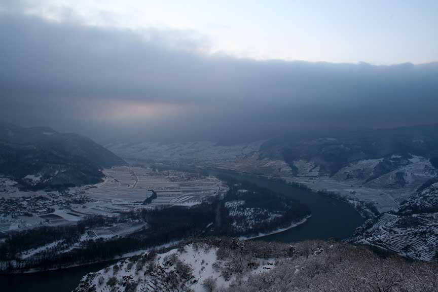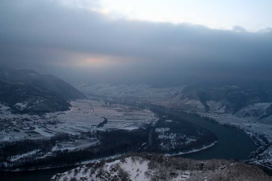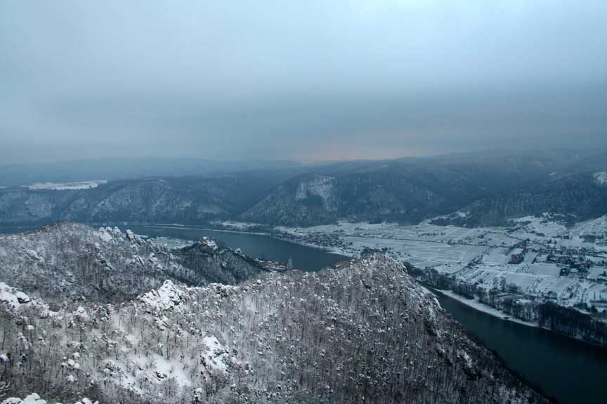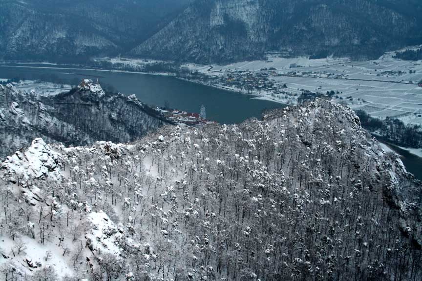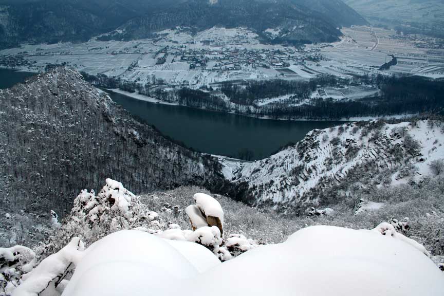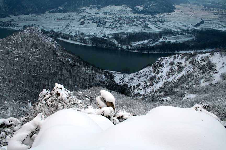 Am 8. Jänner 2006 habe ich mich zum Fotografieren zum Wächterfelsen begeben. Dieser liegt oberhalb von Dürnstein, vis-a-vis von Rossatz. Man hat Ausblick über einen großen Teil der Donauschleifen in der Wachau in dieser Region. Für die Fotos durchstreifte ich dabei Wälder durch hohe Schneemassen.